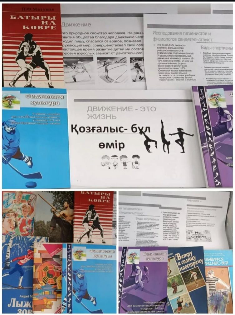 Дене шынықтыру және т.б. онкүндігі аясында мектеп кітапханасында" Қозғалыс - бұл өмір"көрмесі ұсынылды. Кез-келген саладағы спорттық қозғалыстың пайдасы туралы ақпарат (Оқу құралдары, танымал спорт түрлері туралы кітаптар, ұсыныстар).