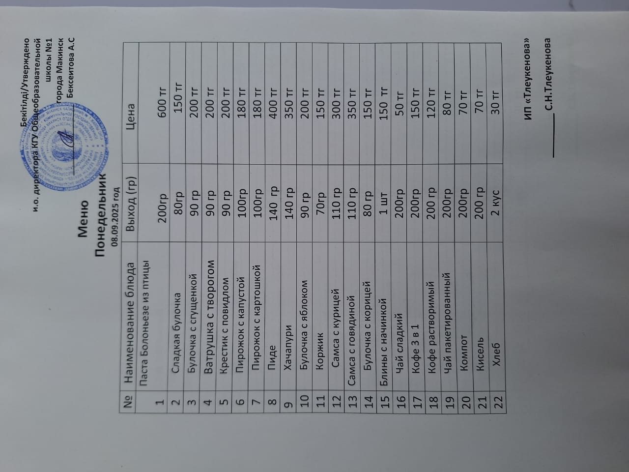 "2024-2025 оқу жылына арналған №1 жалпы білім беретін мектеп" КММ орта білім беру ұйымдарында білім алушылардың тамақтануы бойынша перспективалы 4 апталық (қыс көктем) мәзірі.