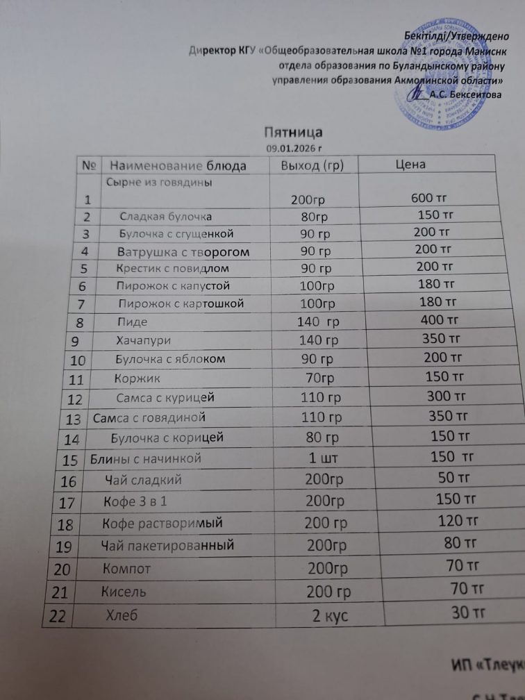 Ас мәзірі 09.01.2026