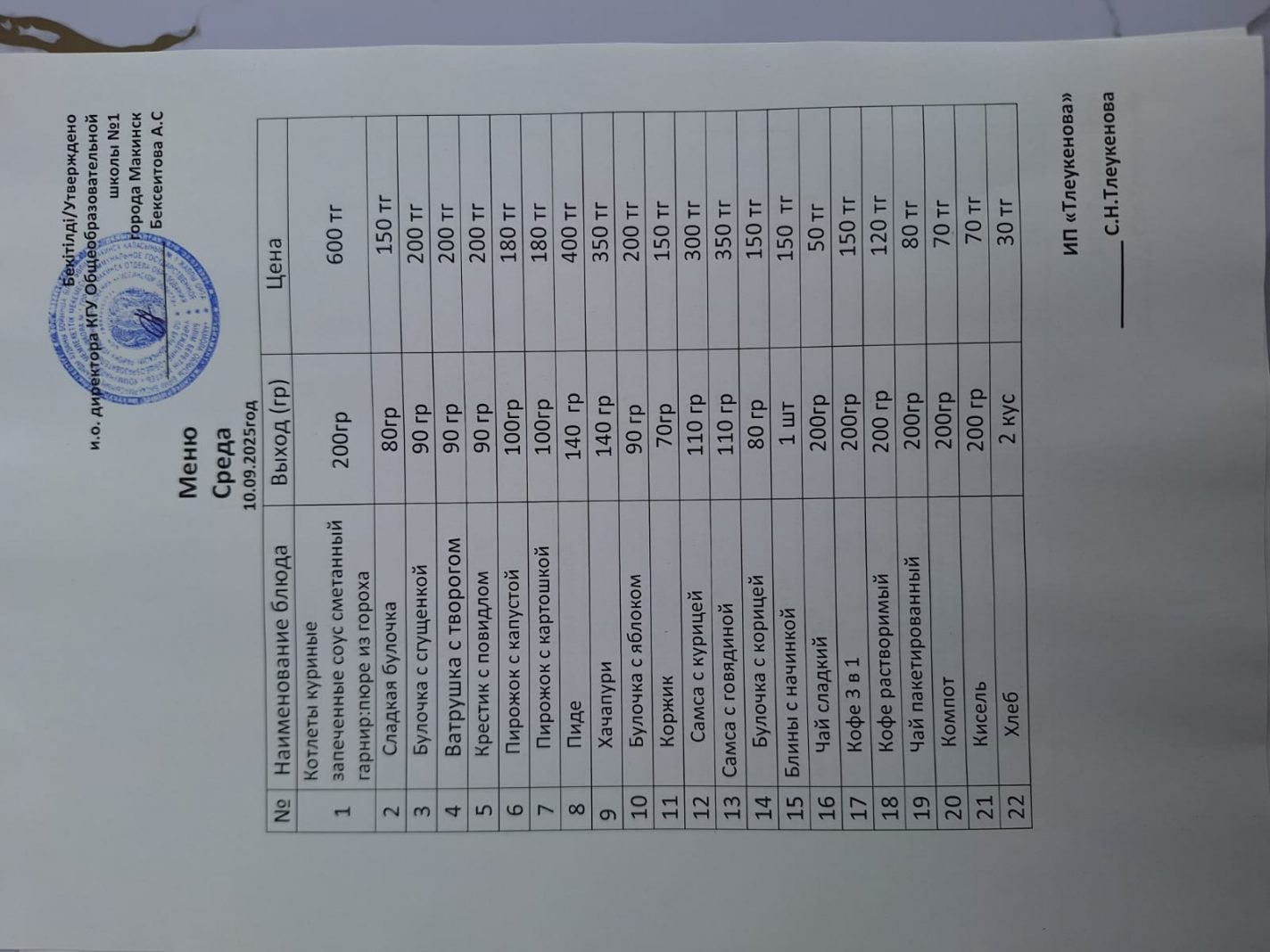 "2024-2025 оқу жылына арналған №1 жалпы білім беретін мектеп" КММ орта білім беру ұйымдарында білім алушылардың тамақтануы бойынша перспективалы 4 апталық (қыс көктем) мәзірі.