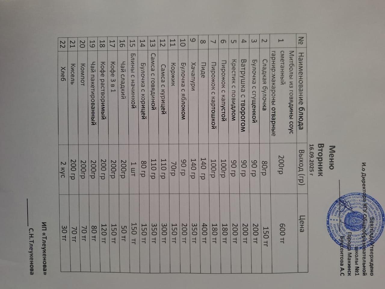 "2024-2025 оқу жылына арналған №1 жалпы білім беретін мектеп" КММ орта білім беру ұйымдарында білім алушылардың тамақтануы бойынша перспективалы 4 апталық (қыс көктем) мәзірі.