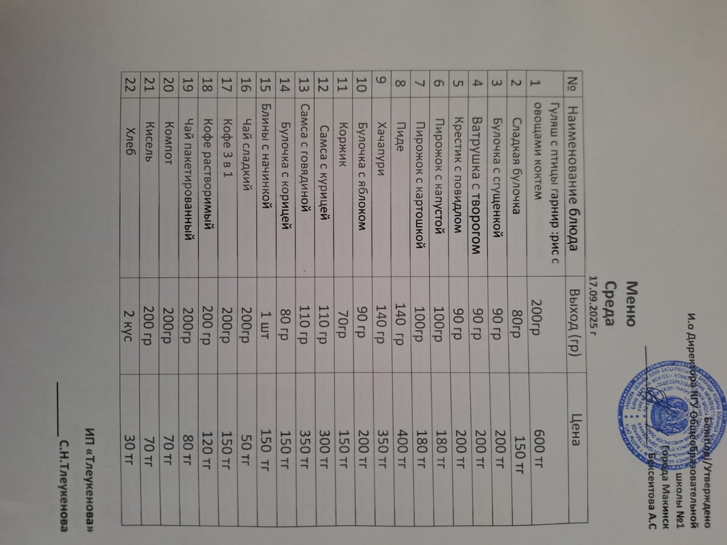 "2024-2025 оқу жылына арналған №1 жалпы білім беретін мектеп" КММ орта білім беру ұйымдарында білім алушылардың тамақтануы бойынша перспективалы 4 апталық (қыс көктем) мәзірі.