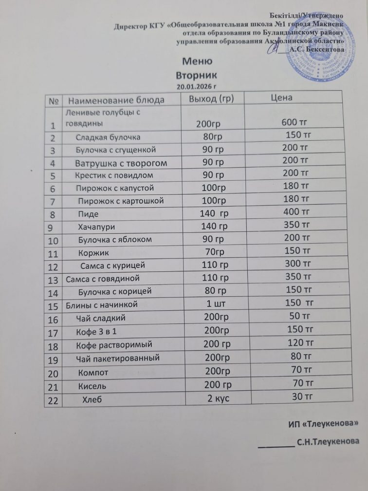 Ас мәзірі 20.01.2026
