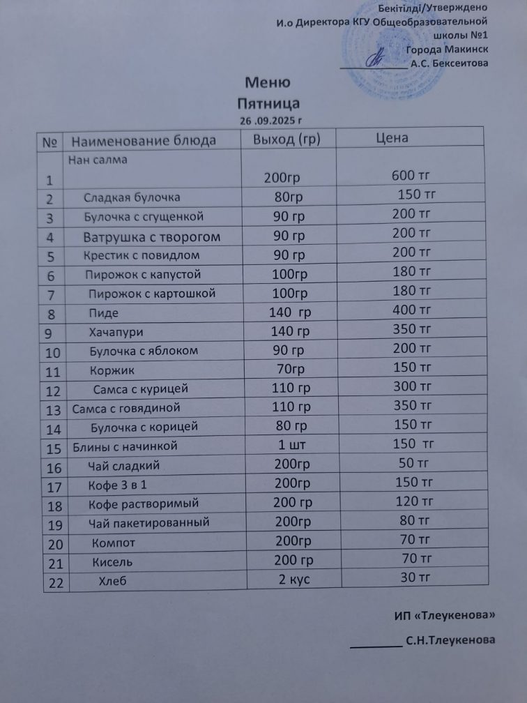 "2024-2025 оқу жылына арналған №1 жалпы білім беретін мектеп" КММ орта білім беру ұйымдарында білім алушылардың тамақтануы бойынша перспективалы 4 апталық (қыс көктем) мәзірі.